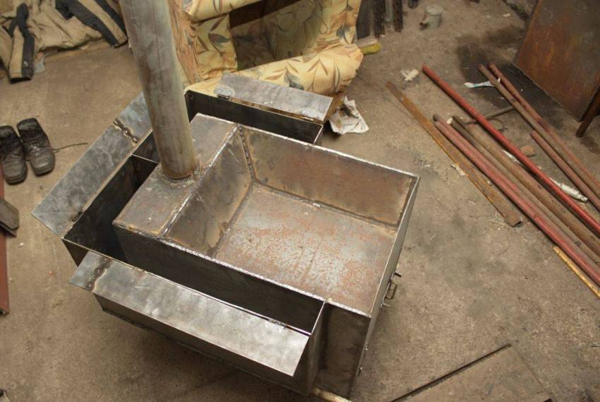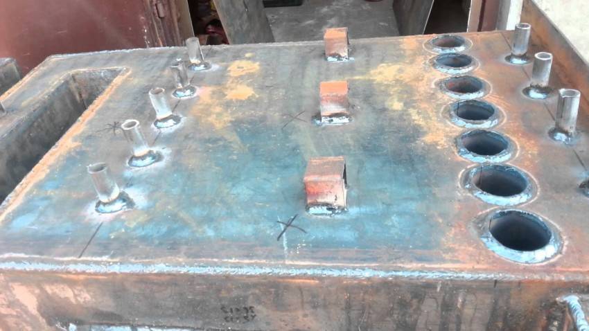 Первым делом для изготовления шахтного котла следует собрать корпус топливника. Делается он из металлических частей, толщина которых 4 мм. Их требуется прихватить сваркой. Начать стоит с нижней части, где будут крепиться боковые части, крышка свода, отверстия для дверец. Должно получиться примерно так же, как на фотографии:
