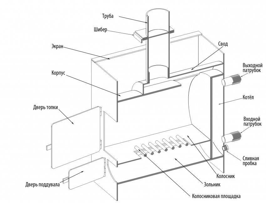 Создать чертежи твердотопливных котлов длительного горения своими руками будет проще после подробного изучения стандартной конструкции: