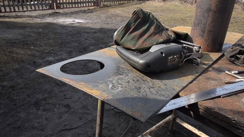 В первую очередь к блину 412 мм приваривается дымоход. Затем внутри корпуса на высоте 30-35 см от топочного отверстия необходимо приварить временные упоры. Это может быть проволока или арматура. На них сверху опускается блин с дымоходом.
