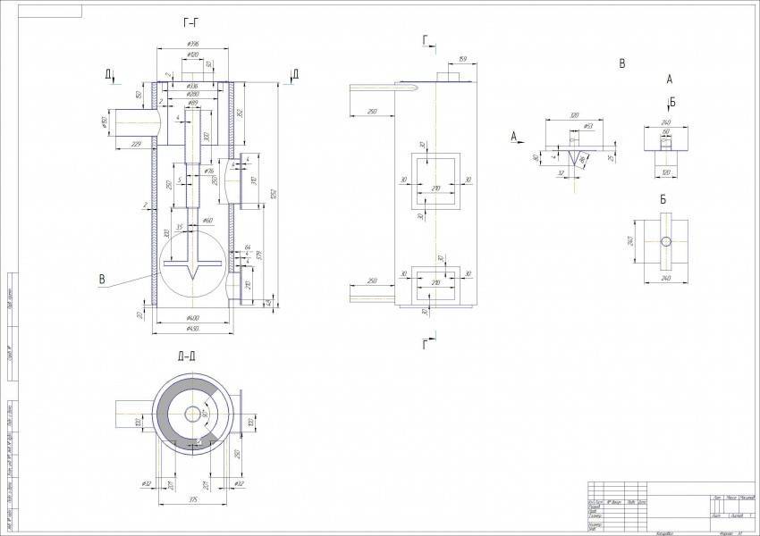 Для реализации частных проектов не обязательно соблюдению ГОСТов. Но чем подробнее получился чертеж твердотопливного котла длительного горения своими руками, тем проще будет исключить ошибки на ранних стадиях.