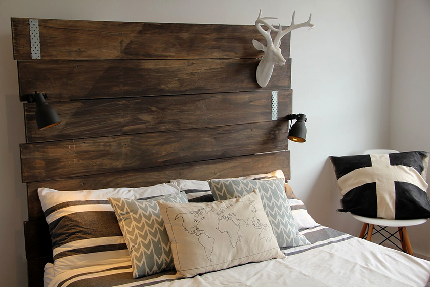 Настенное изголовье для двухъярусной кровати изготавливается из 3 досок размером 25х100х1800 мм и 12 брусков габаритами 25х100х450 мм. Для первого ряда, который будет соприкасаться со спинкой, используются короткие изделия. На изнаночной стороне оборудуется скрытый крепеж. На соответствующих местах изголовья с помощью саморезов прикручиваются металлические пластины. Свободный их край при навешивании будет вставляться в пазы шин.