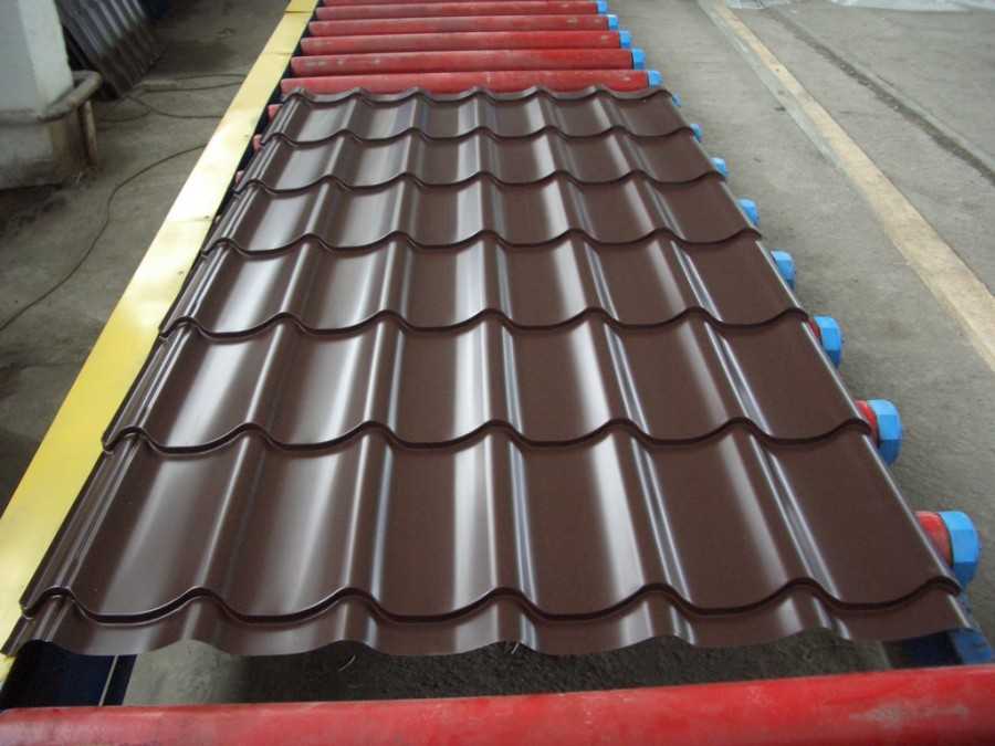 Малый вес покрытия и кровли в целом. Вес 1 м2 металлочерепицы варьируется в пределах 3-6 кг, что существенно ниже натуральной черепицы или шиферных листов. То есть монтаж листов металлочерепицы не потребует установки усиленного фундамента или максимально прочных несущих стен.