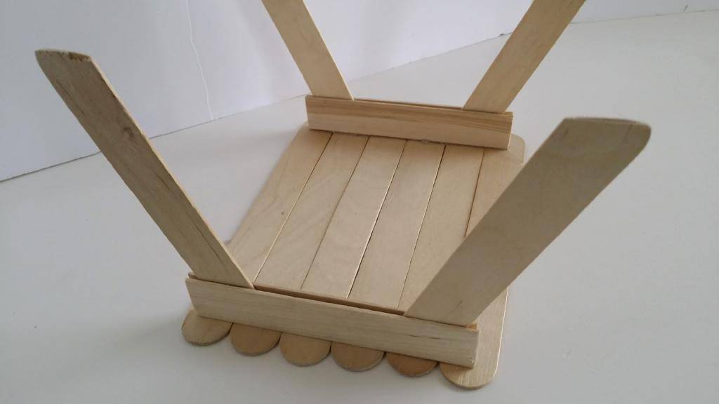 4. Возьмите две палочки со срезанными концами и сложите друг на друга. После чего между ними вставьте палочки по подобию ножек. Склейте их таким образом и приклейте к столешнице. Точно такие же ножки стола сделайте и на другой стороне.