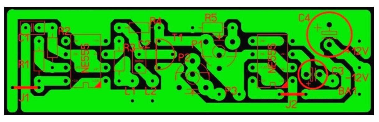 - Располагают на плате транзисторы, резисторы и конденсаторы и припаивают согласно приведенной ниже схеме.