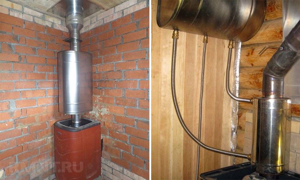 Вариант второй — цилиндрический бак вокруг дымохода. Основное достоинство бака этого типа — минимум «хищения» пространства в парилке, которая, как правило, имеет минимальную площадь для быстрого и экономичного прогрева. Недостаток бака заключается в сравнительно высокой сложности его самостоятельного изготовления. Бак такой конструкции есть ни что иное как обычный сегмент дымохода: он очень просто соединяется с вытяжным каналом каменки посредством поворотного колена или короткой вставки, при этом сечение внутренней трубы можно выбирать любым, благодаря чему не возникнет трудностей с подбором подходящей сэндвич-трубы.