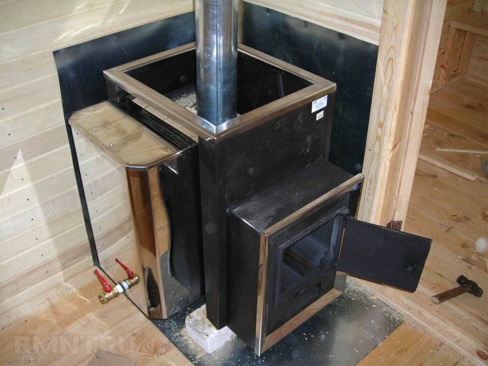 Наиболее подходящими для такого размещения бака будут печи с закрытой каменкой, однако следует выбирать вместимость водонагревателя с учётом пониженной теплоотдачи.