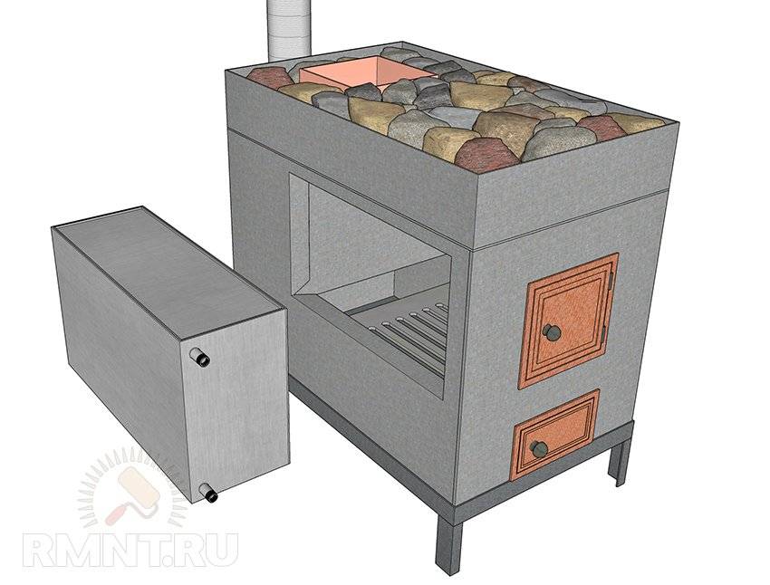 - Бункер. Можно выполнять открытого типа и закрытого. Чтобы сажа и копоть из топки не попадали на камни при их нагреве, наш бункер будет закрытого типа. Для обеспечения доступа к камням в нем делается специальная дверца в боковой части печки.