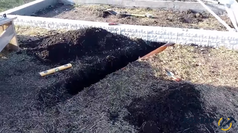 Траншею можно копать вручную или миниэкскаватором, что довольно дорого. Глубина рассчитывается следующим образом: к точке промерзания нужно добавить толщину трубы, плюс по 3-4 см снизу и сверху. Снизу для песчаной подушки, сверху для перестраховки (точка промерзания является средней величиной, в связи с чем при сильных морозах в бесснежную зиму грунт промерзает на несколько сантиметров ниже).