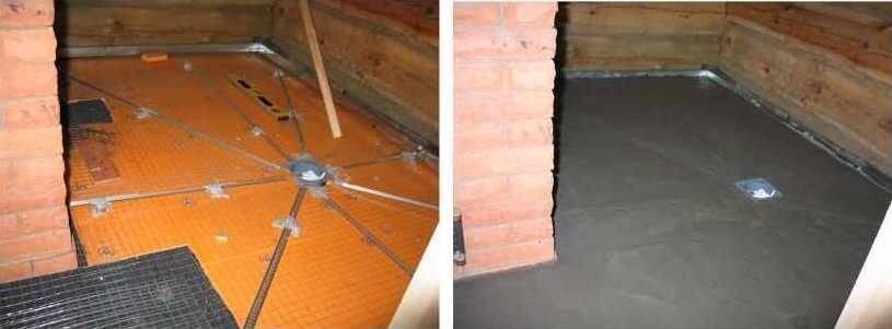 Выполнение подобных полов затруднительно, потому что необходимо обеспечивать наклон не только в одну сторону пола, а к одной точке (сливному отверстию диаметром в 10-15 см).