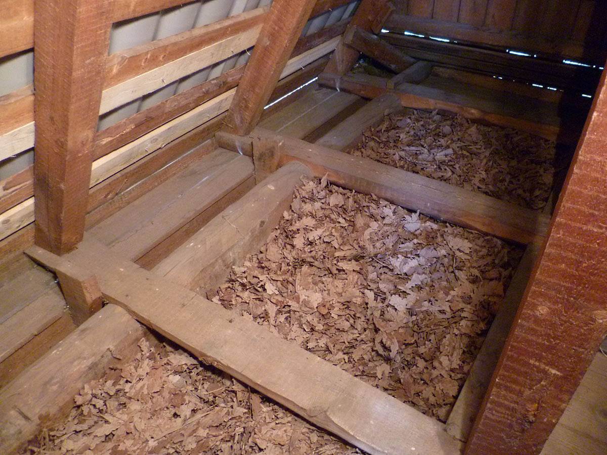 - Со стороны чердака между лагами укладываем утеплитель (минеральную каменную вату, керамзит или глину с соломой)