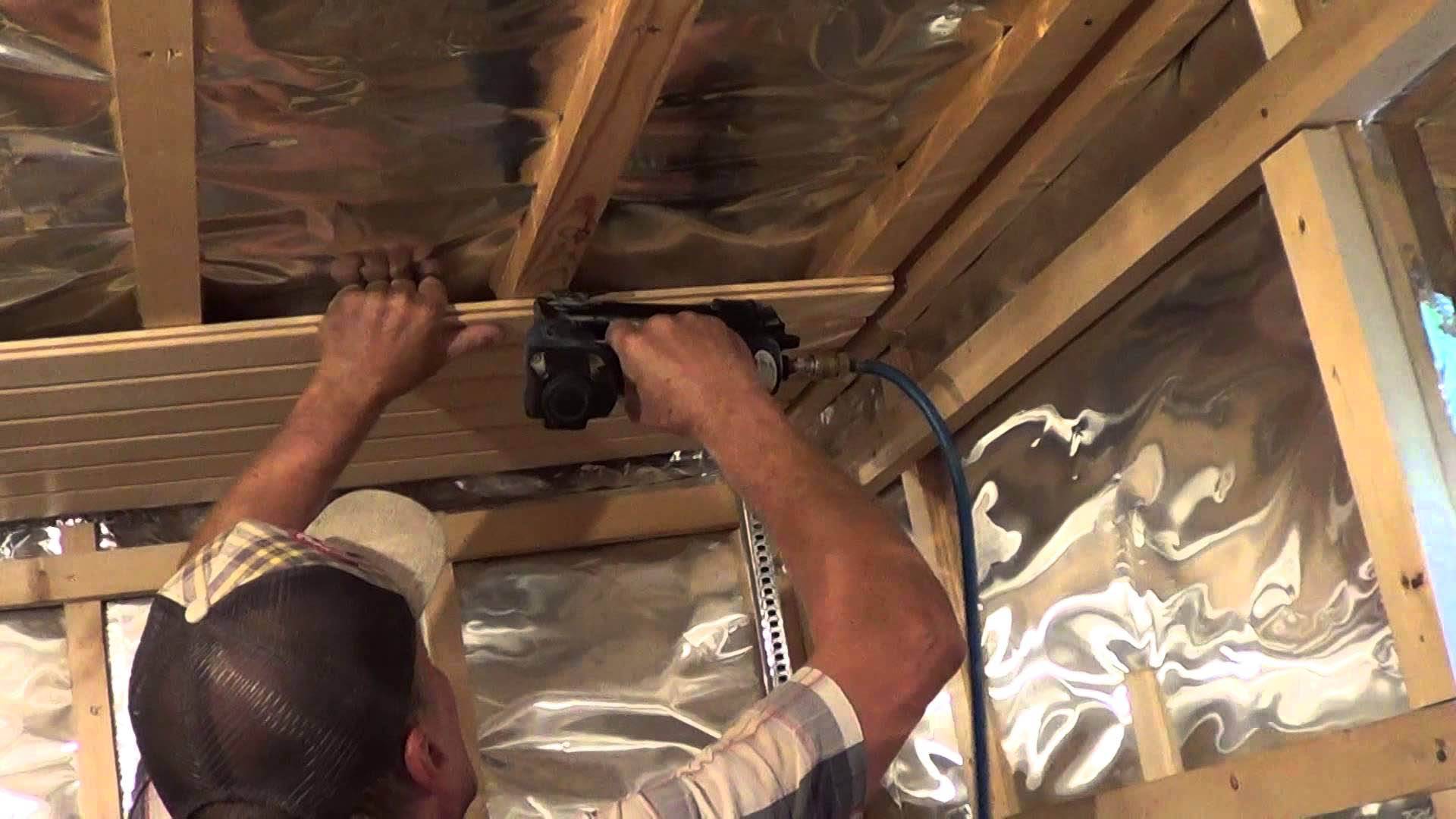 - Если расстояние между балками большое, то надо дополнительно сделать обрешетку и уже на нее монтировать вагонку, обрешетку делают брусом 20 на 40 мм с шагом 400 мм.