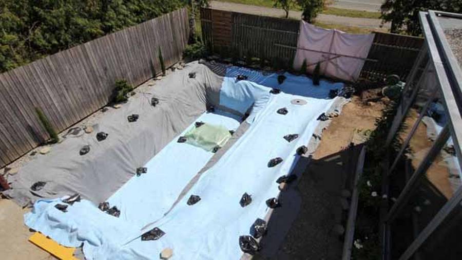 Пленку перед работой укладывают на несколько часов на солнечном месте, чтобы она прогревшись, стала более эластичной. Укладку пленки делают при теплой погоде. На утрамбованный котлован стелют внахлест полотнища геотекстиля или войлока, они нужны для защиты гидроизоляционной пленки от со временем выпирающих корней и камней.