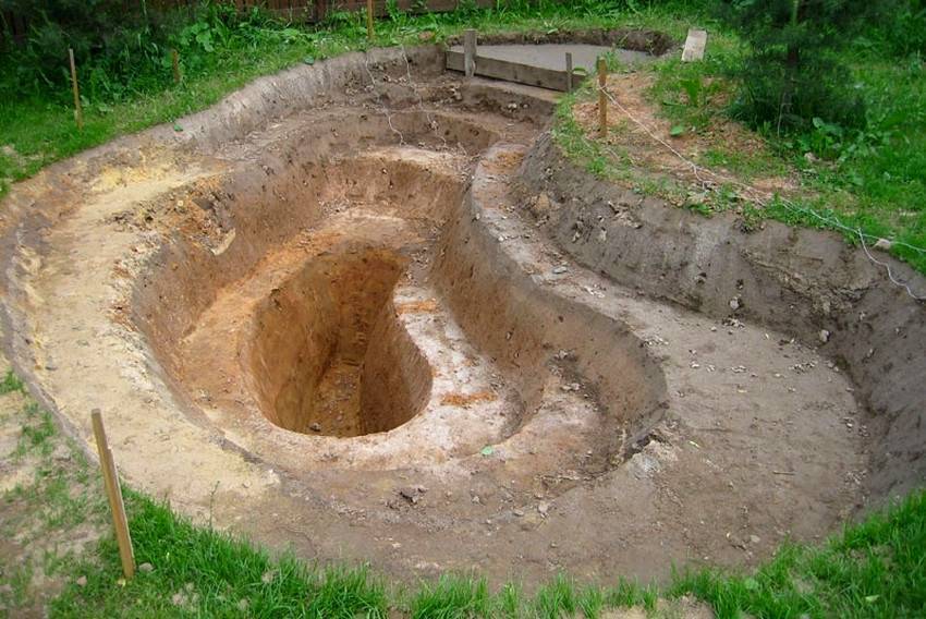Заглубившись на 50–60 см обозначается второй контур с помощью того же садового шланга или каната. Выемка грунта происходит по тому же принципу. Ширина и высота ступеней зависит от размеров и назначения пруда. Для декоративного водоёма вполне достаточно и одной ступени.