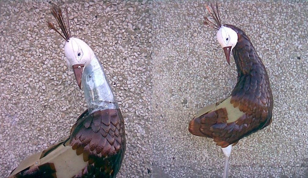 Чтобы сделать клюв, из верхней части бутылки вырежьте два треугольника. Один должен быть немного больше другого. Согните маленький треугольник посередине и прикрепите к голове гвоздями – это будет нижняя часть клюва. Таким же образом сделайте верхнюю часть. Вырежьте из бутылок детали хохолка, украсьте фольгой или раскрасьте и прикрепите к голове, замаскировав место крепления перьями. Нарисуйте глаза. Поставьте чудо-птицу там, где ваши гости смогут беспрепятственно любоваться ею.