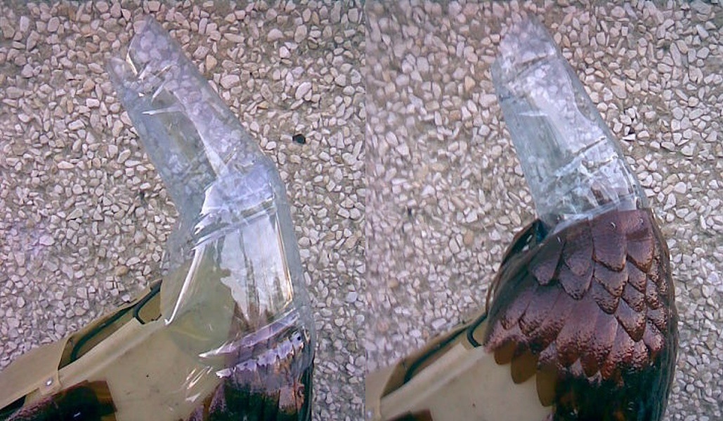 Из красной пластиковой бутылки вырезается клюв, и крепиться на предназначенное для него место. Затем, используя специальный пистолет нужно начать клеить перья на птичье тело. Начинать нужно от хвоста, а заканчивать шеей, перья птицы крепятся немного внахлест, это можно увидеть на фото.