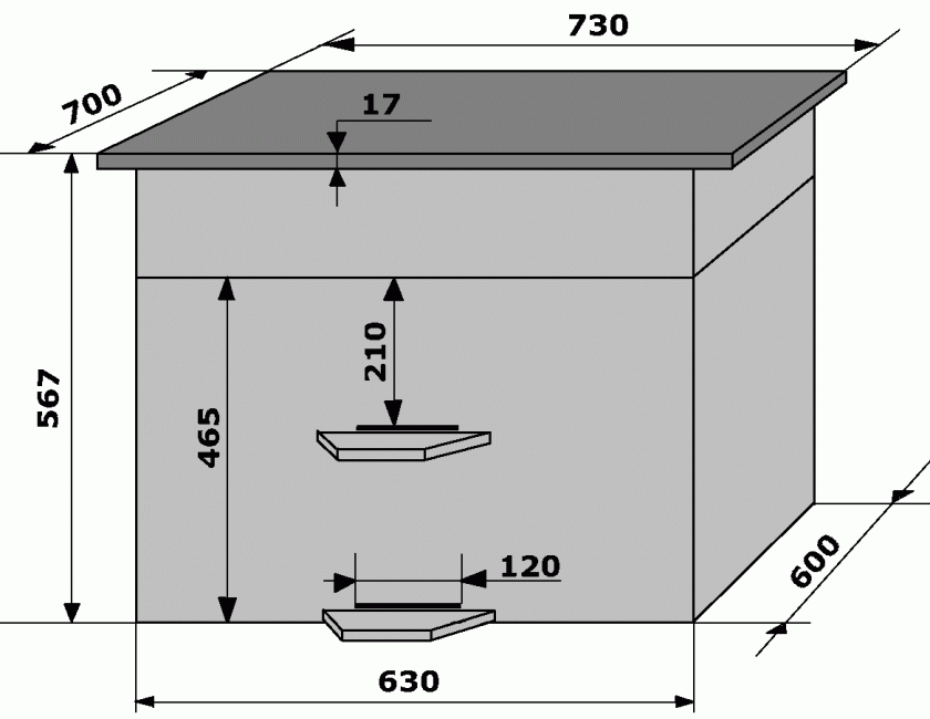 - если конструкция получается тяжелая, для тумбы потребуется фундамент, на схеме указывают его линейные размеры;
