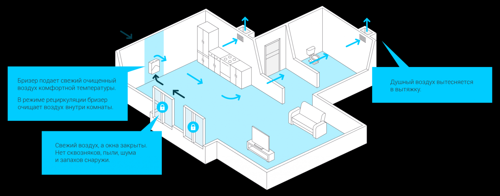 - Уличные воздушные потоки смешиваются с комнатным воздухом.