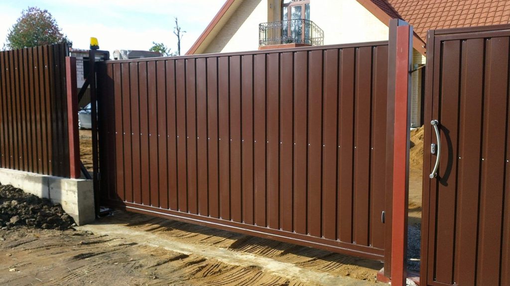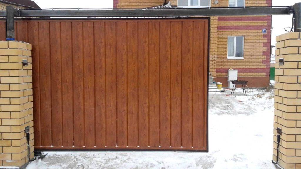 Данные конструкции отличает простота и надёжность. Полотно ворот ставят на ролики. На поверхности крепят специальный рельс, по которому оно будет ездить. Для устойчивости предусматривают дополнительную поддержку.