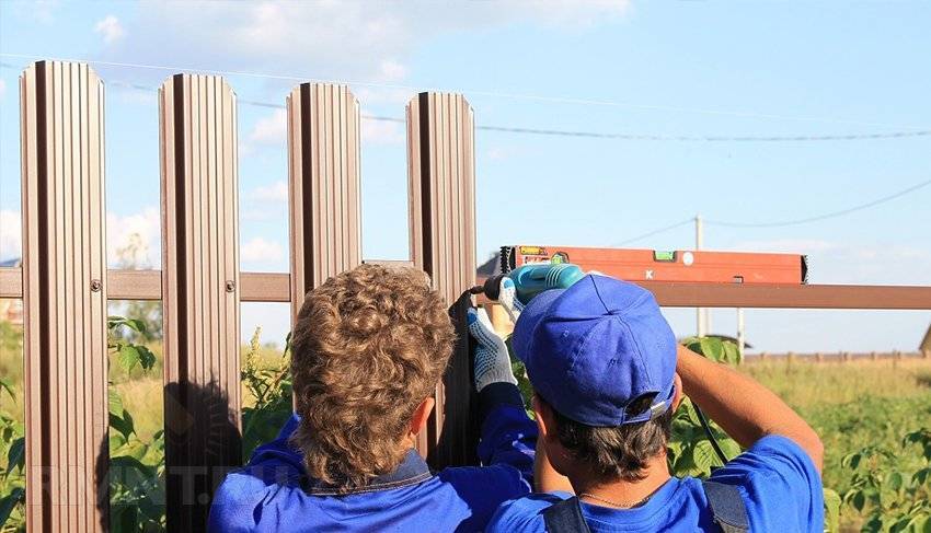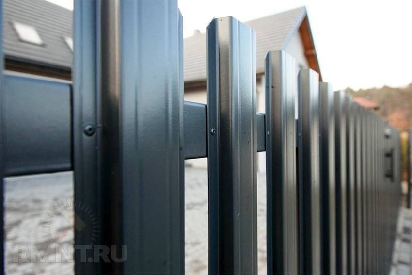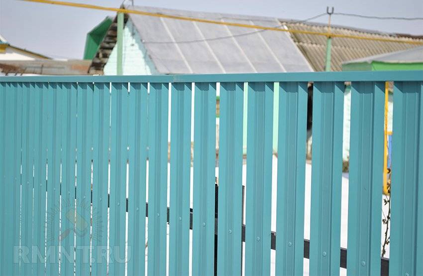 В большинстве случаев при монтаже не требуется подрезка планок, но при необходимости ее выполняют болгаркой и замазывают срез битумной мастикой под цвет покрытия. Если забор имеет ровный верхний срез, ограждение накрывают горизонтальной планкой, которая крепится подкрашенными саморезами к каждой пятой штакетине.