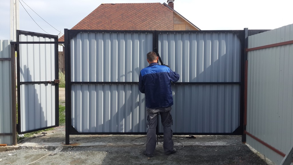 После были сварены и прикреплены ворота. Как последние штрих — установлены сверху доборные элементы — П-образный профиль, закрывающий верхушку забора и заглушки на трубы.