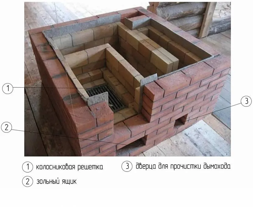 - На всех этапах монтажа металлической фурнитуры, учитывайте зазор на тепловое расширение. Колосниковую решетку кладите не на раствор а в бороздки кирпичей. Она должна свободно сниматься и доставаться из печи.