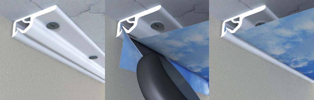 Здесь все просто. Профиль вставляется в стену (конструктивная особенность наглядна представленная на схеме-фото), принимает в себя полотно, и фиксируется клином. Замыкает всю конструкцию декоративная планка, которая не только является украшением системы, но и дополнительным фиксатором полотна.