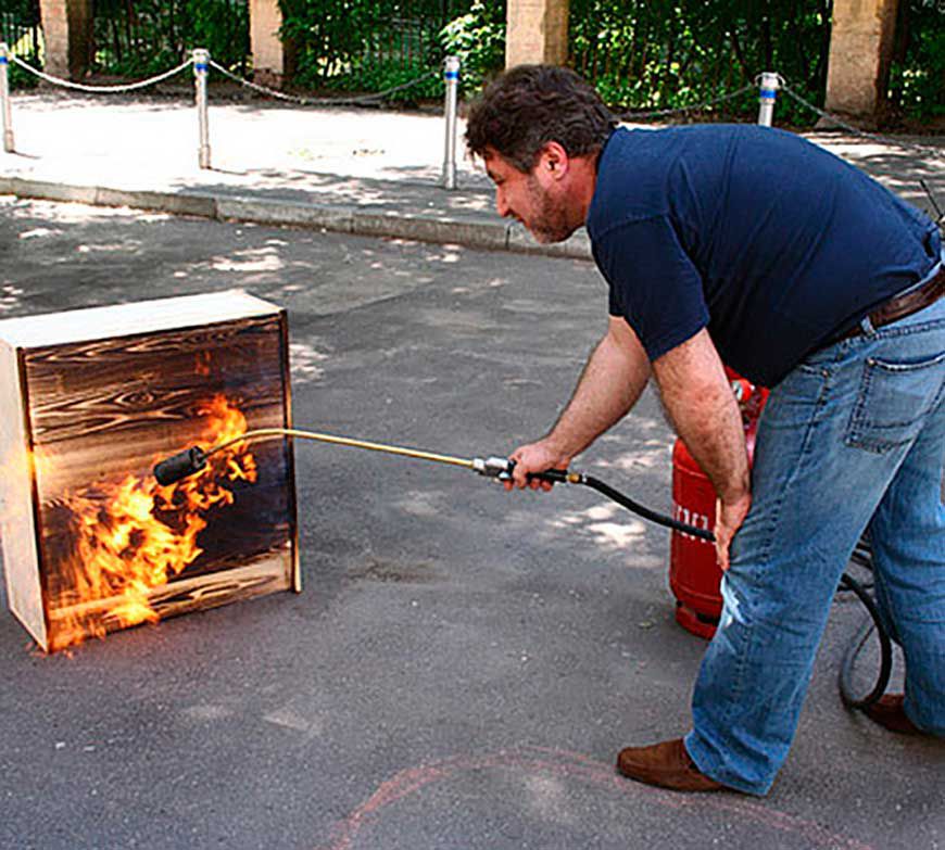 Прежде всего, позаботьтесь о технике безопасности. При обжиге древесины рядом не должно быть легковоспламеняющихся предметов и жидкостей, и лучше такие работы вообще проводить на свежем воздухе. Обязательно проверьте исправность горелки или паяльной лампы.