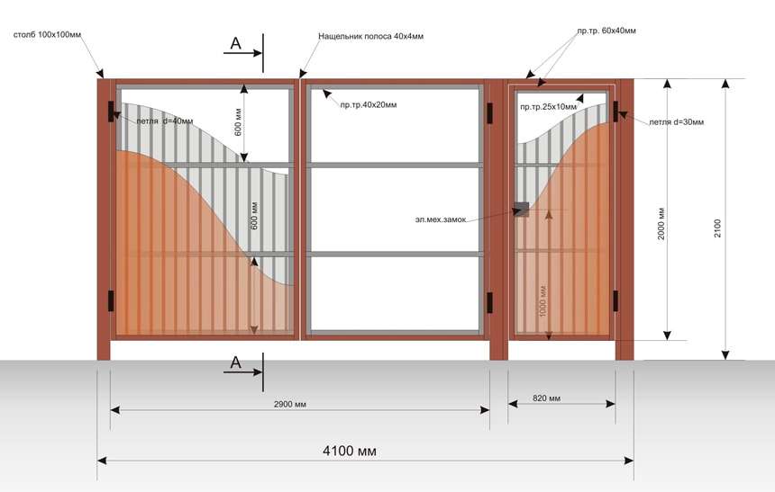 Перед тем как сделать такие ворота из металла, первым делом необходимо снять точные размеры проема: ширину и высоту. Не стоит забывать, что технический просвет (расстояние между уровнем дороги и нижней кромкой ворот или калитки) должен составлять не менее 50 мм. При зазоре 100—150 мм ворота можно будет без труда открыть даже при достаточно большом снежном покрове.