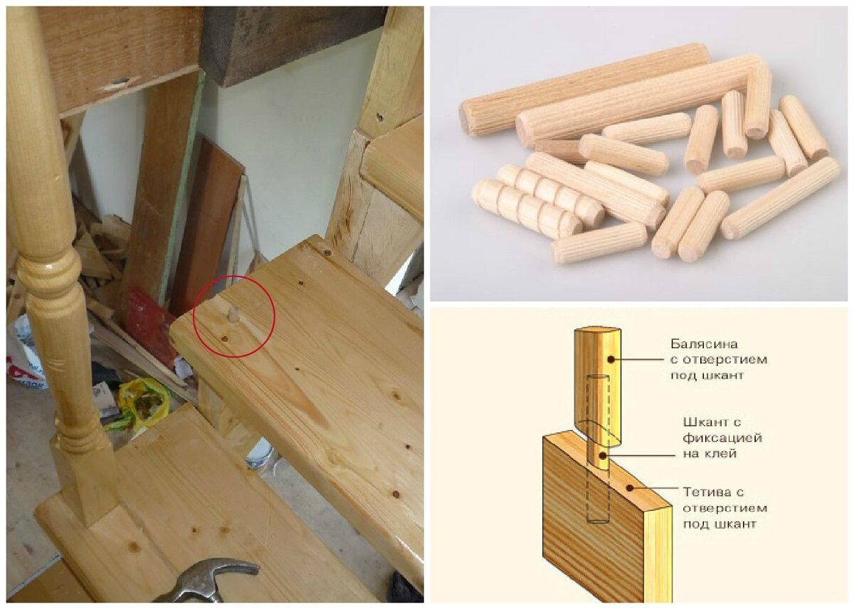 Как крепить балясины к лестнице? Деревянные конструкции предполагают использование обыкновенных шкантов круглой формы. Их диаметр не должен превышать ¼ диаметра стойки, а длина – двух диаметров балясины.