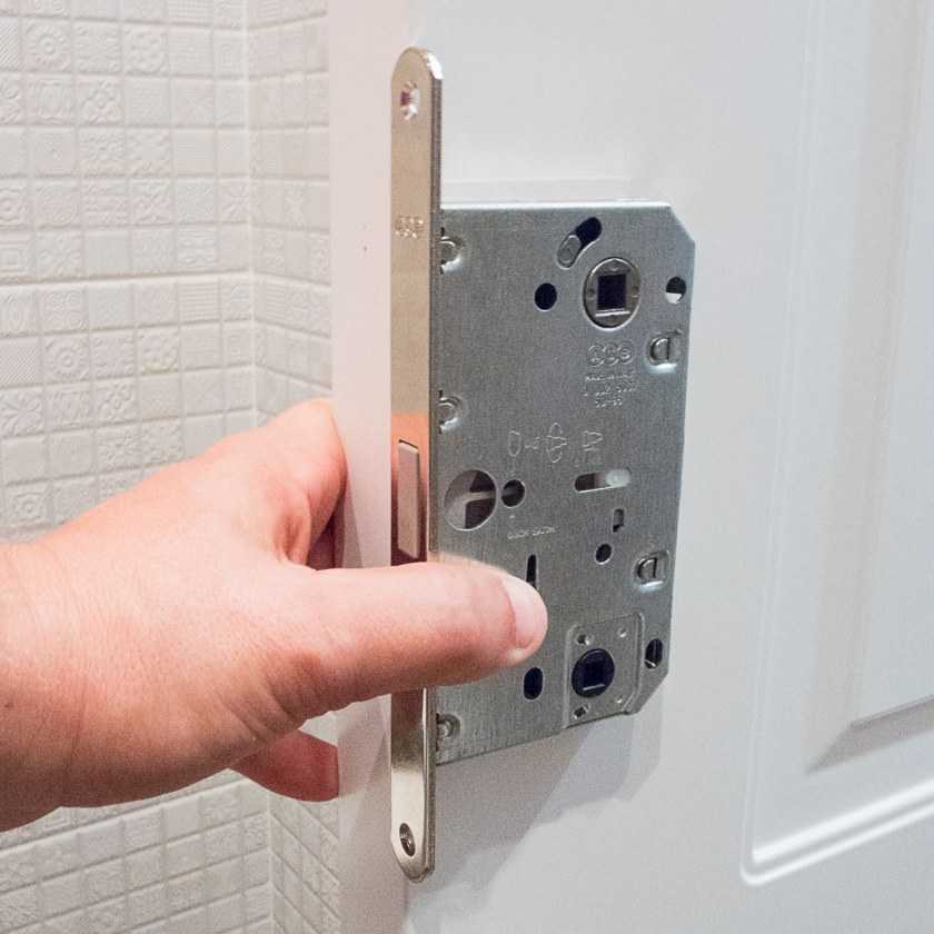 Прикручиваем защелку. Установка дверной фурнитуры практически окончена. Если двери закрываются на замок, дополнительно устанавливаем еще вертушку, которая закрывает двери.
