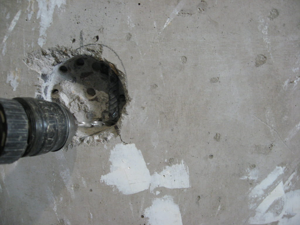 Если нет коронки по бетону, то проделать дырку можно дрелью с победитовым сверлом. Сначала на всю глубину насадки высверливается центральное отверстие, а затем тем же сверлом делаются дырки по линии окружности.