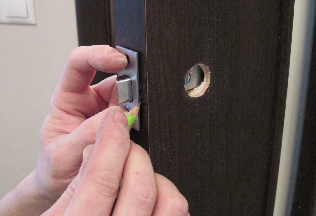 - карандашом отмечается контур накладки защелки, а также места вкручивания фиксирующих саморезов;