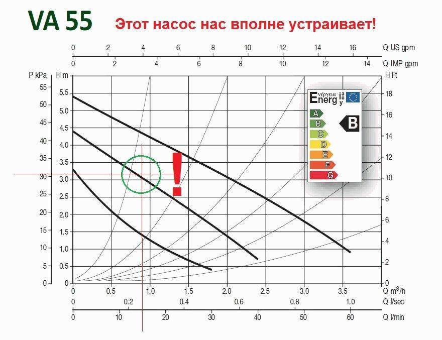 Допустим, Вы решили остановиться на отличных насосах DAB, итальянских насосах великолепного качества по совершенно адекватной цене. Пользуясь каталогом, или менеджерами нашей компании, определяете группу насосов, в параметры которых попадает необходимая рабочая точка. Решаем, что этой группой будет группа VA. Выбираем наиболее подходящий график гидравлической кривой, лучше всего подходит кривая насоса VA 55/180 X.