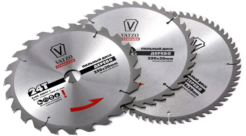 - Тип и угол зубьев. Каждый тип сконструирован под определённые задачи. Тип F. T. (плоский резец) предназначен для продольного пиления различного вида древесины. Тип АТВ (сменный резец) предназначен для продольного и поперечного распила разных пород древесины, обработки ДСП, ОСП и фанеры. Тип Combi (комбинированный резец) предназначен для любых видов пропила. Тип TCG (трапециевидный плоский резец) применяется для обработки изделий из древесины. Тип HiFND (сменный резец) предназначен для работы с материалом, который склонен к раскалыванию. Важным параметром является угол наклона зубьев. Положительный угол наклона от 15 º до 20 º увеличивает подачу инструмента, но делает грубым распил. Отрицательный угол наклона от 0 º до -5 º замедляет скорость инструмента, но делает чистый распил.