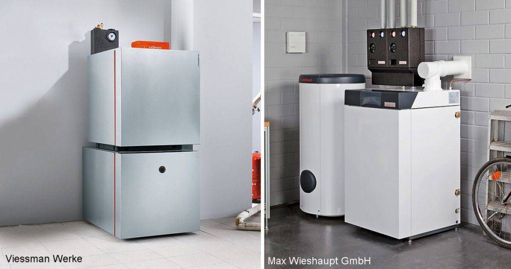 Vitoladens 300-C (Viessmann) — жидкотопливный котел с коррозионно устойчивым теплообменником (фото слева). Жидкотопливный конденсационный котел с высоким КПД WTC-OB (Weishaupt, Германия, фото справа)
