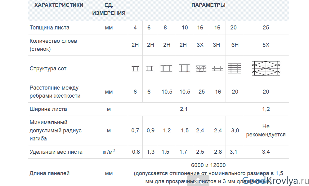 Стандартная длина листов сотового пластика 6 и 12 м, ширина 2,1 м. Профиля выпускают в соответствии с размером поликарбоната — 6 м.