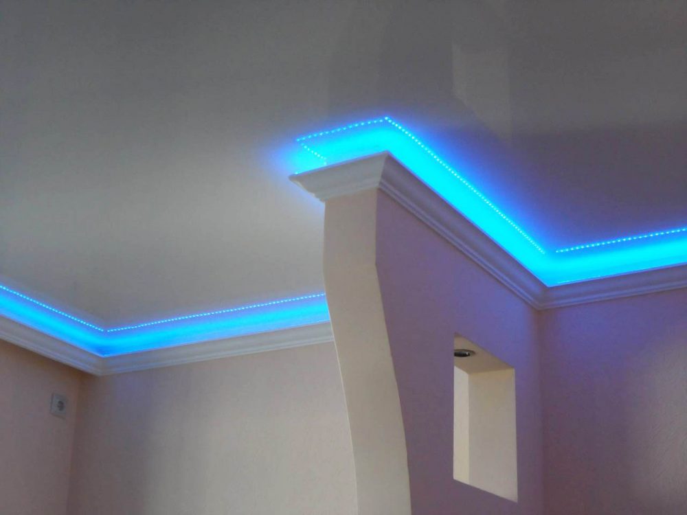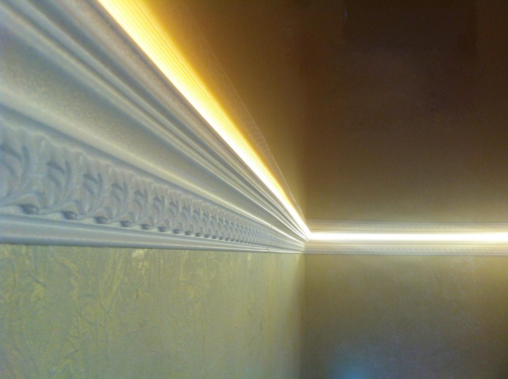 В зависимости от расположения светодиодов, подсвечивается потолок или выявляется фактура стен. В первом случае багеты устанавливаются ниже уровня перекрытия (примерно на 20 см).
