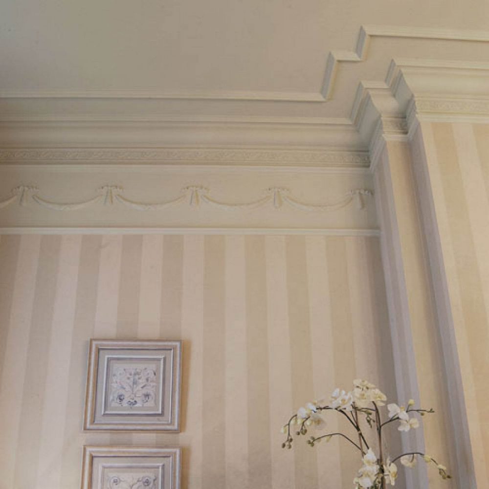 Редко используется для отделки, разве что в интерьерах с роскошными колоннами, лепкой, выдержанными в дворянском дизайне. Искусно сделанная лепнина формирует молдинги, которые выглядят как настоящие шедевральные конструкции.