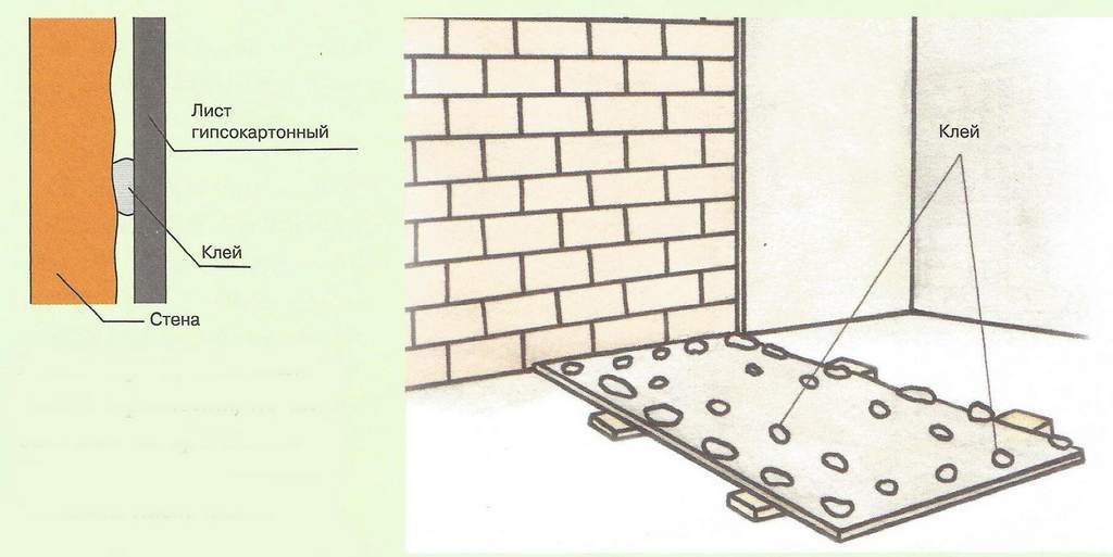 Во втором случае, ГКЛ, с помощью специального строительного клея приклеивается прямо к стене. Этот метод хорош, когда нужно максимально сохранить размеры помещения, но тогда нельзя будет установить теплоизоляцию и потребуется специальная подготовка стен.