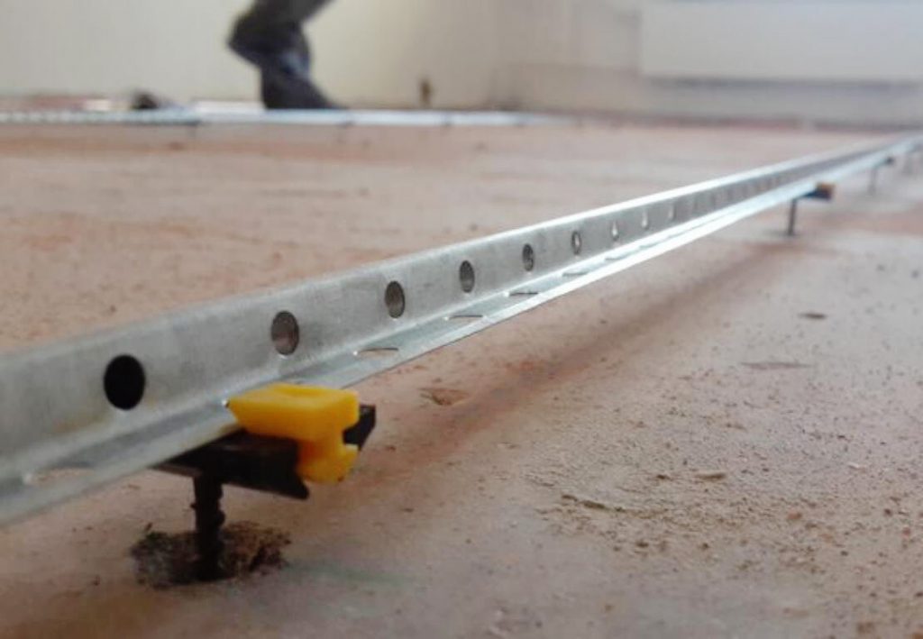 Первые направляющие следует крепить в углах комнаты, начиная от окна. Обязательно проверить правильность выполнения монтажа с помощью отвеса. Расстояние до промежуточного маячка составит не менее 60 см, но чаще всего специалисты ставят следующий ориентир, отступив от первого 1 м.