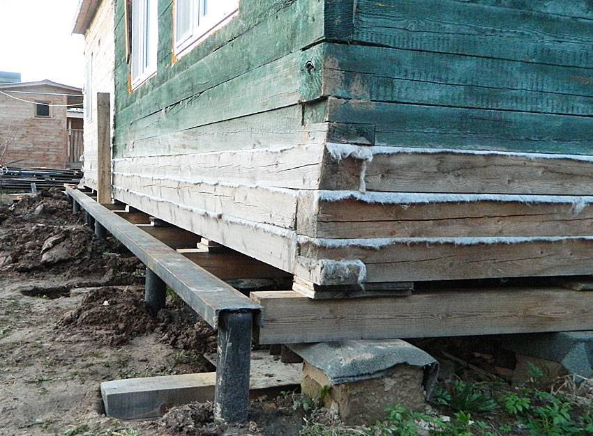 Разница между заменами прогнивших венцов сруба с ленточным и столбчатым фундаментом состоит только в процессе установки домкратов. Первый вариант более трудоемкий, так как фундамент нужно частично разрушить. Для столбчатого фундамента это делать это не нужно, так как в его структуре много пространства для установки домкратов.