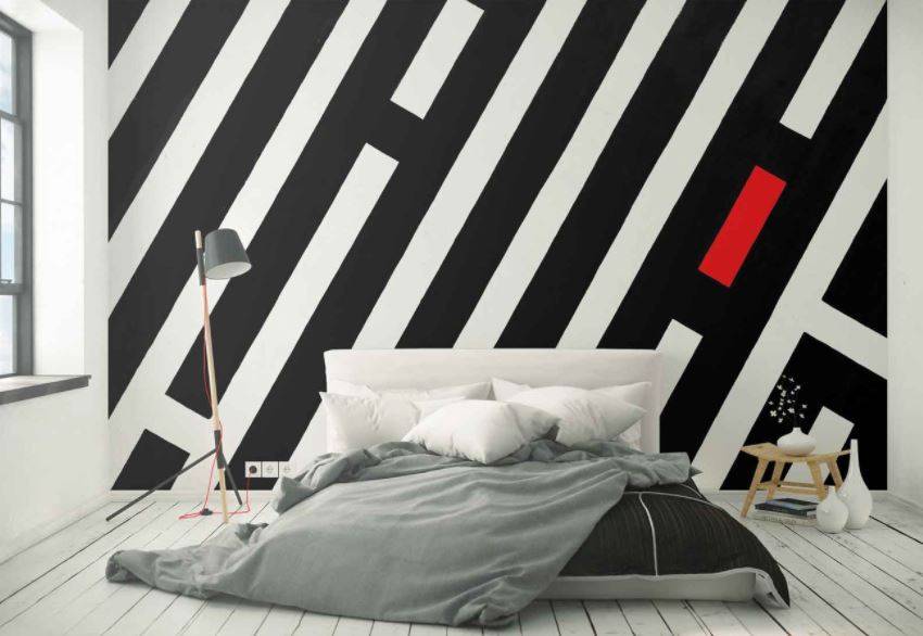Геометрические фигуры и ломанные узоры неплохо подходят к некоторым современным интерьерам спален, а получить их можно только обоями. Туда же обои с полосками и мелкими текстурами.