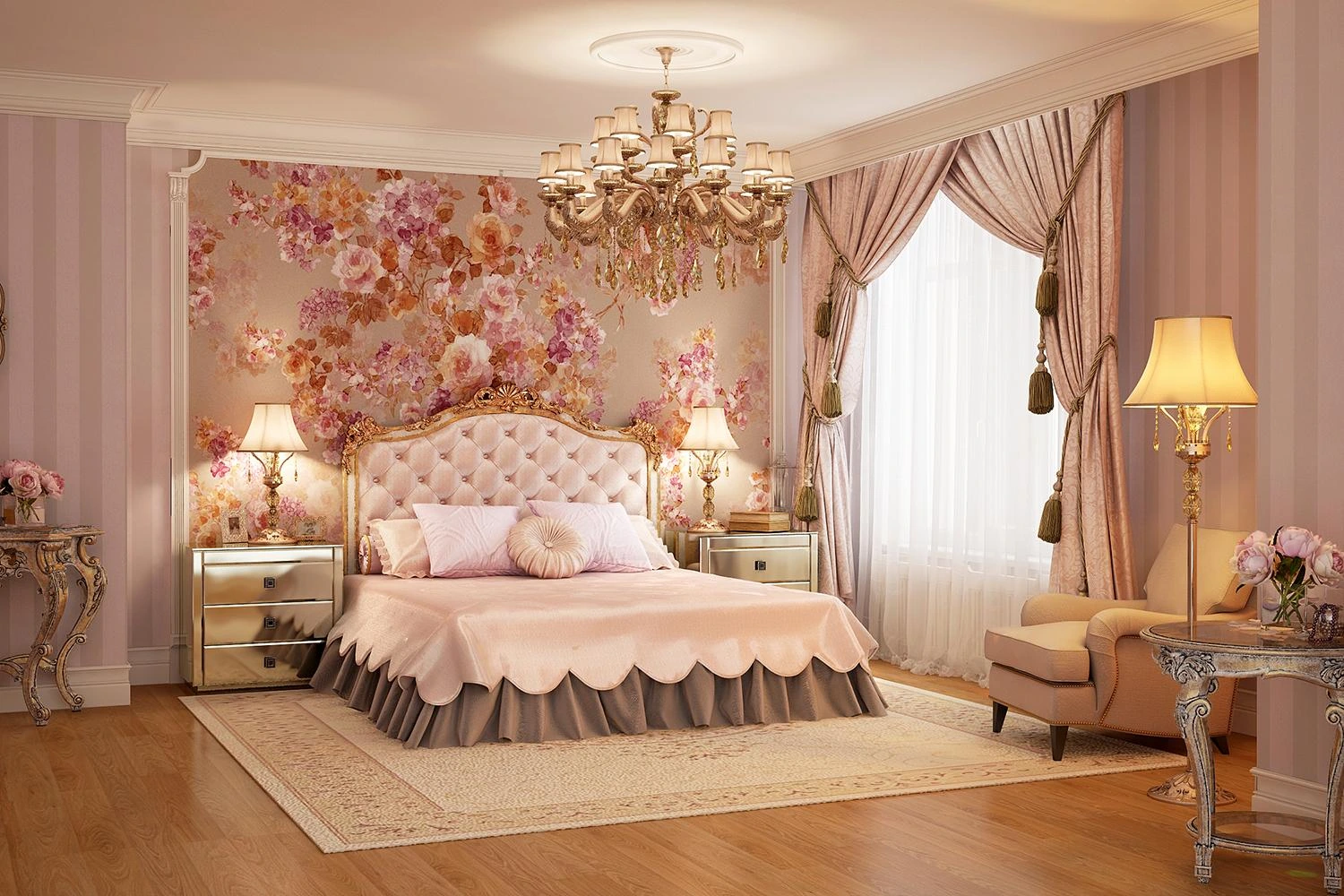 Этот стиль по достоинству оценят любители роскоши. Зефирные оттенки белого, розового, персикового, светло-сиреневого идеально сочетаются с аристократичными золотисто-серебряными узорами, гипсовой лепниной, колоннами и хрустальными люстрами.