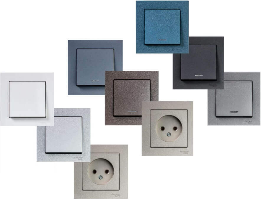 Еще одна серия розеток и выключателей, дизайн которой был продуман до совершенства. Изюминка AtlasDesign – плоские поверхности всех элементов (рамок, механизмов, клавиш). При этом рамочная конструкция и 10 цветовых палитр позволяют скомбинировать изделия таким образом, чтобы добиться максимальной гармонии с интерьером. Цвета следующие:
