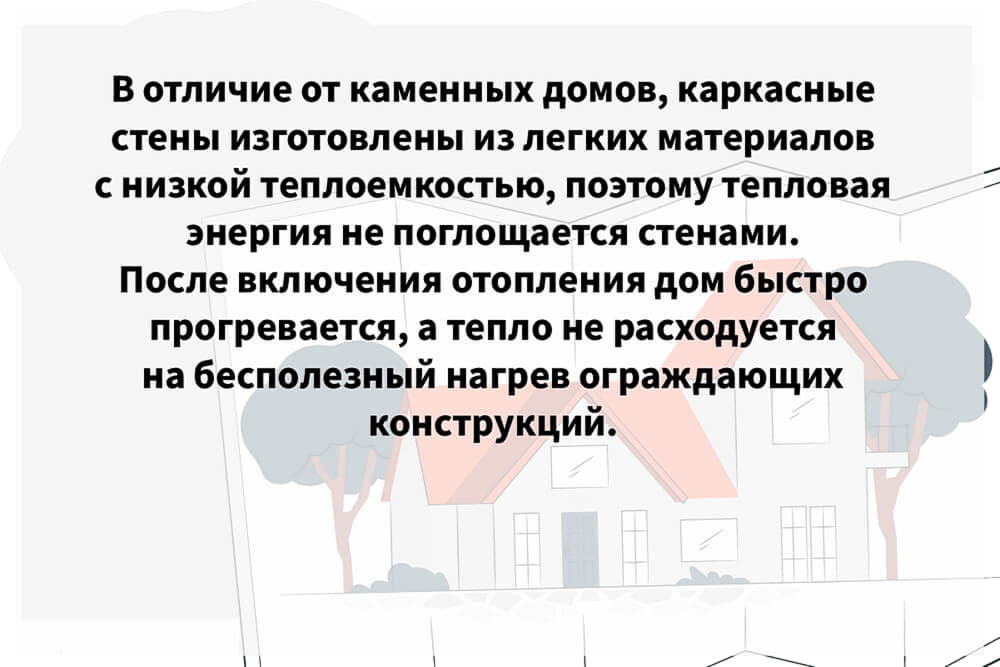 Стены каркасных домов возводят из материалов, которые обладают лучшими теплотехническими характеристиками, чем кирпич. С точки зрения расходов на отопление выгоднее жить в каркаснике.