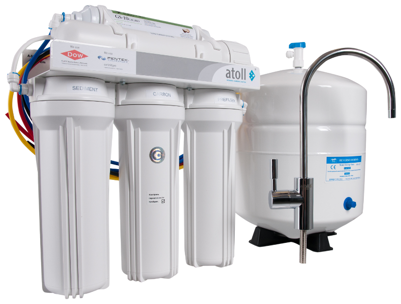 Это наиболее дорогостоящая фильтрационная система, которая представлена в рейтинге. Но ее стоимость вполне оправдана. Этот фильтр имеет в наличие две очень полезные функции: функция насыщения кислородом и минерализация. В чем состоит польза? Как указывалось еще вначале, мембрана может сделать воду идеально чистой, очищая как вредные для человеческого организма вещества, так и полезные. Вода выходит практически дистиллированная, что не всегда является хорошо. Но фильтр Atoll после всего процесса очистки (в этом фильтре установлено пять ступеней) дополнительно обогащает воду полезными минералами и веществами. Что делает ее намного полезней, нежели после обычной чистки обратным осмосом.