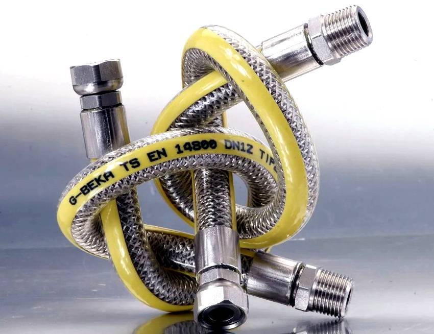 Высоким спросом пользуются у населения резиновые армированные рукава. Они внешне напоминают шланги подвода ГВС, ХВС. Для отличия снаружи в оплётку вплетают стальные нити жёлтого цвета – это обозначает, что изделия служат для подачи газа.