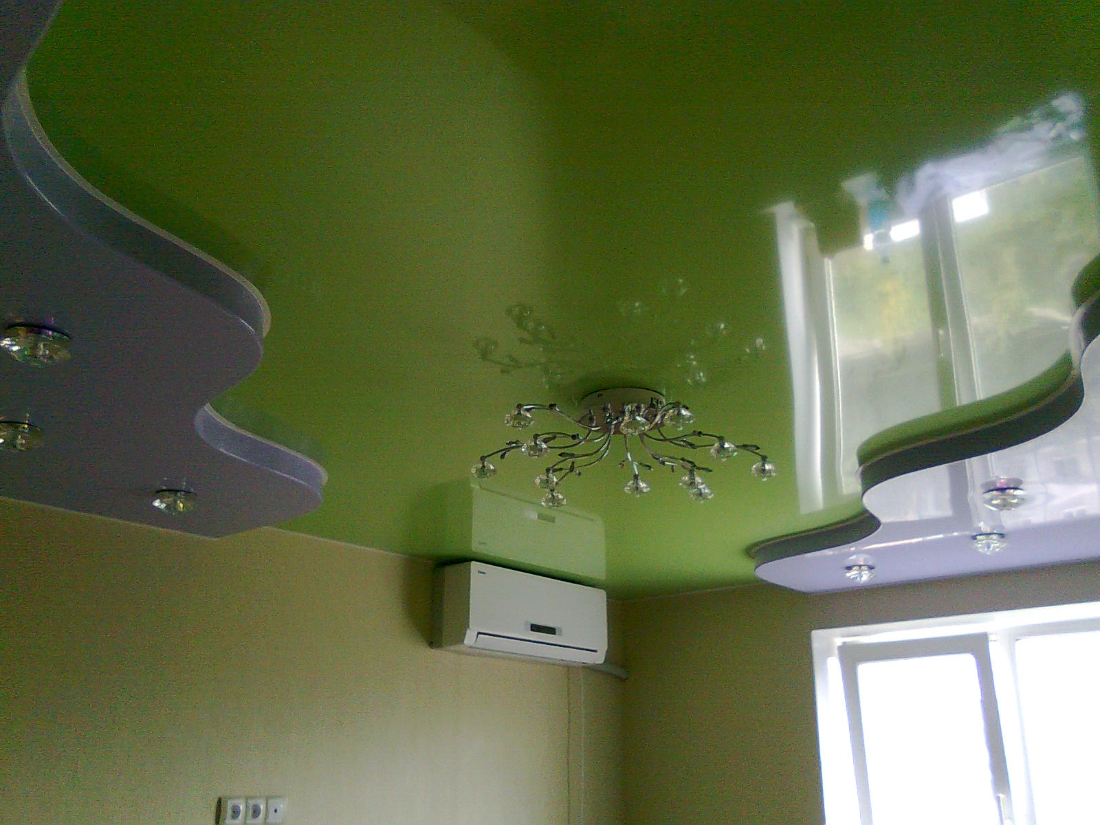 - оптимальный вариант оформления потолочной поверхности — натяжные глянцевые полотна. Соотношение: цена-качество в этом случае идеальное. Правильно подобранный цвет может вписать такую поверхность в любую комнату квартиры. Исключением будут кабинет и спальня, здесь лучше смотрятся матовые полотна;