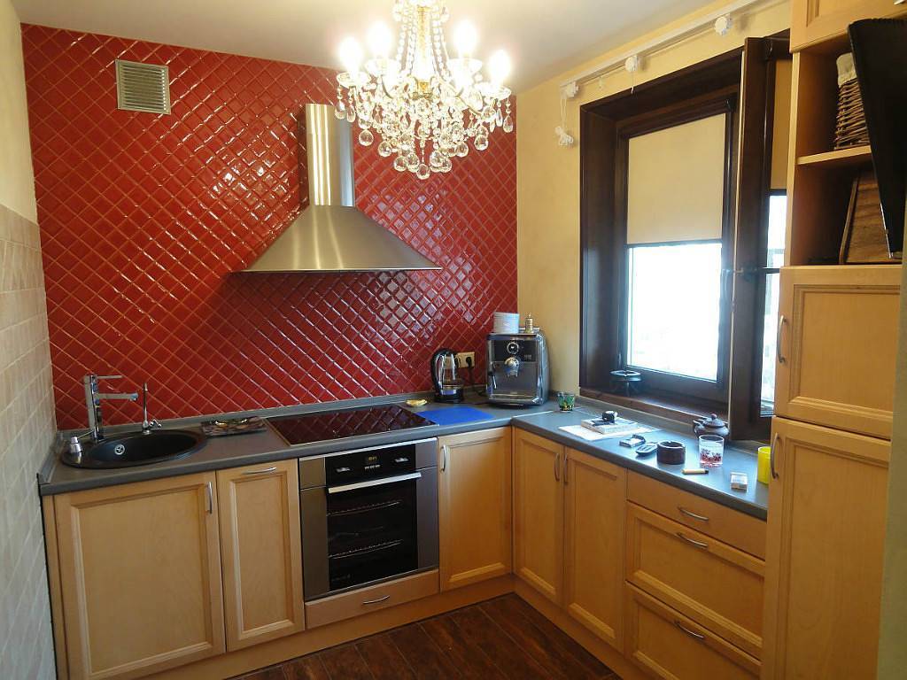 - для кухни лучше выбирать плитку с ламинированным покрытием: она более устойчива к влаге и перепадам температуры.