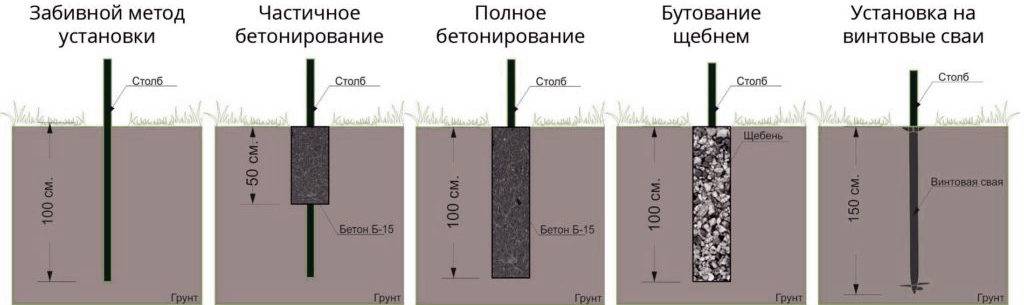 Методы различаются по стоимости, трудозатратах и необходимым материалам. Подходящий вариант подбирается с расчетом предполагаемых нагрузок от веса забора, условий эксплуатации, составу почвы и глубине течения грунтовых вод. Для ветреных и морозных регионов потребуется конструкция повышенной прочности, чтобы забор не повело.